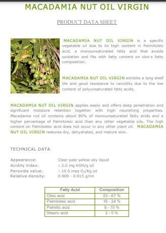 Macadamia nut oil is known to absorb quickly into the skin, leaving a light, velvety, protective barrier on the skin. Macadamia nut oil also has a low level of oral toxicity, making it a useful ingredient in lip and baby care products.